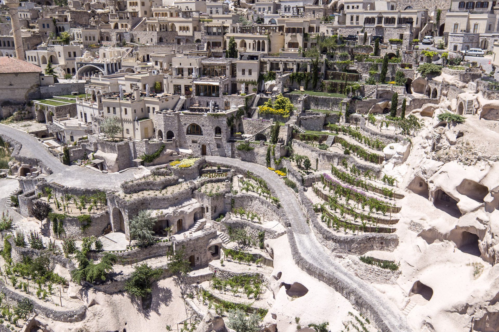 The 100 to 200-year-old houses the hotel is formed from, all carved form pale local stone, are furnished by combining traditional Turkish handicrafts with modern furniture. Each of the 71 rooms is very different from the next. Meticulously crafted over 26 years, each has its own unique aura and personality.
