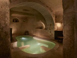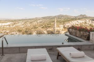 The spa comprises a pool, Hammam, sauna, steam room, private studio, Pilates area and seven therapy rooms for treatments. There is also a heated outdoor pool with astonishing views of Mount Erciyes and Güvercinlik Valley.
