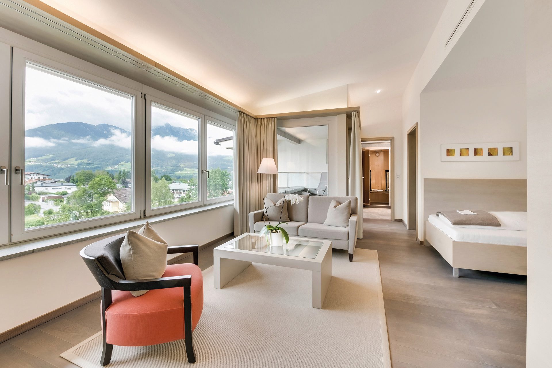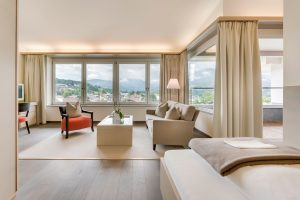 Accommodation at Park Igls is designed to complement the wellness experience – calm, uncluttered, and comfortable. The rooms and suites are elegantly understated, decorated in soft, neutral tones with natural materials and floor-to-ceiling windows that draw in the surrounding alpine light. All rooms feature balconies or terraces with views of the mountains or the garden, offering a serene space to reflect and unwind.